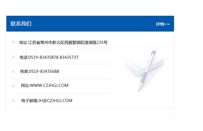 地址:常州市新北區(qū)友邦商務(wù)大廈1幢16、17層  電話:0519-85101652  傳真:0519-85112595  郵編:213022  網(wǎng)址:www_cz-jiayue_cn.dingyezhuangshi.com  郵箱:xiajifengaa@163.com